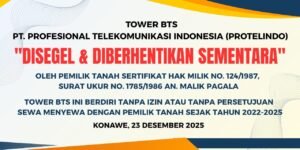 (Grup,BPN) Bentara patrolinews.id – Konawe — Tower Base Transceiver Station (BTS) milik PT. XL Axiata Tbk dan PT. Profesional Telekomunikasi Indonesia (Protelindo) yang berdiri di atas lahan bersertifikat di Jalan Poros Konawe–Kolaka, Kelurahan Wonua Hoa, Kecamatan Lambuya, Kabupaten Konawe, Provinsi Sulawesi Tenggara, terancam disegel paksa. Tower tersebut diduga kuat berdiri dan beroperasi tanpa persetujuan serta tanpa dasar hukum dari pemilik sah tanah.