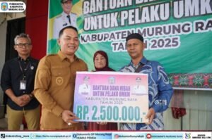 (Grup BPN) Bentara patrolinews.id – Pemerintah Kabupaten (Pemkab) Murung Raya (Mura) melalui Dinas Koperasi UKM Perindustrian dan Perdagangan (Diskop UKM Perindag) kembali menunjukkan komitmennya dalam memperkuat sektor Usaha Mikro, Kecil, dan Menengah (UMKM), Senin (29/12/2025) Bupati Mura, Heriyus, bersama Wakil Bupati Mura, Rahmanto Muhidin, menyerahkan secara simbolis bantuan hibah tahun anggaran 2025 kepada pelaku UMKM di halaman Kantor Bank Pembangunan Daerah Kalimantan Tengah Cab. Puruk Cahu.